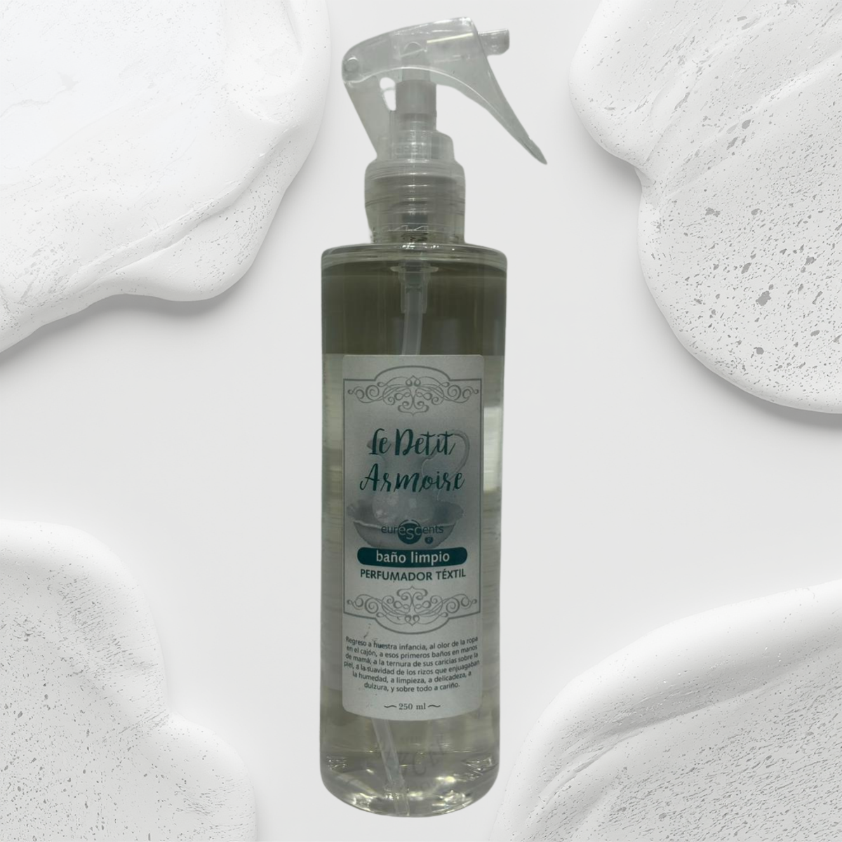 Además de su uso en el baño, este perfume textil puede emplearse en otros espacios del hogar donde se busque una fragancia discreta y reconfortante. Su aroma transmite calma, pureza y confort, creando una atmósfera agradable tanto para el día a día como para recibir visitas.